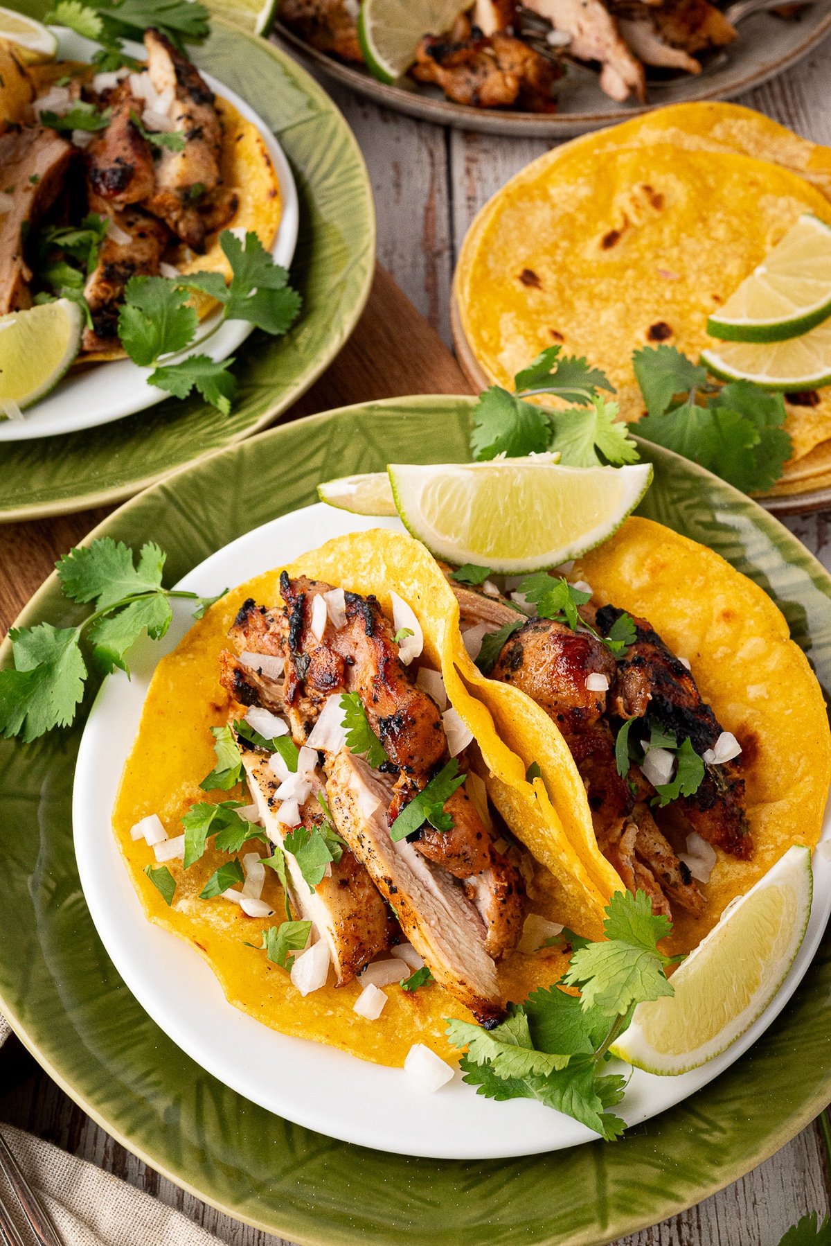 Marinated and grilled chicken thighs make a tasty cilantro lime chicken taco. Easy and flavorful dinner recipe! Serve street corn style with corn tortillas, chopped cilantro and onion or customize with your favorite taco toppings.