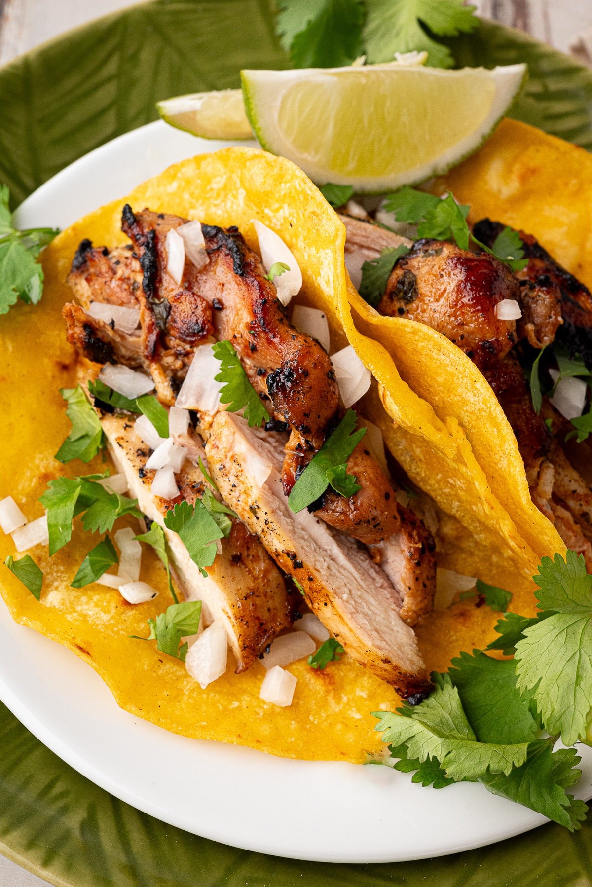 - Assemble tacos: Warm tortillas. Slice chicken thighs into strips. Placed sliced chicken in tortillas and top with extra cilantro, onion and additional toppings of your choice.