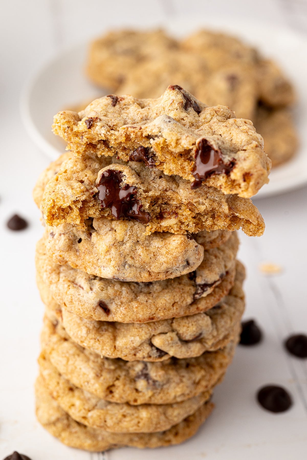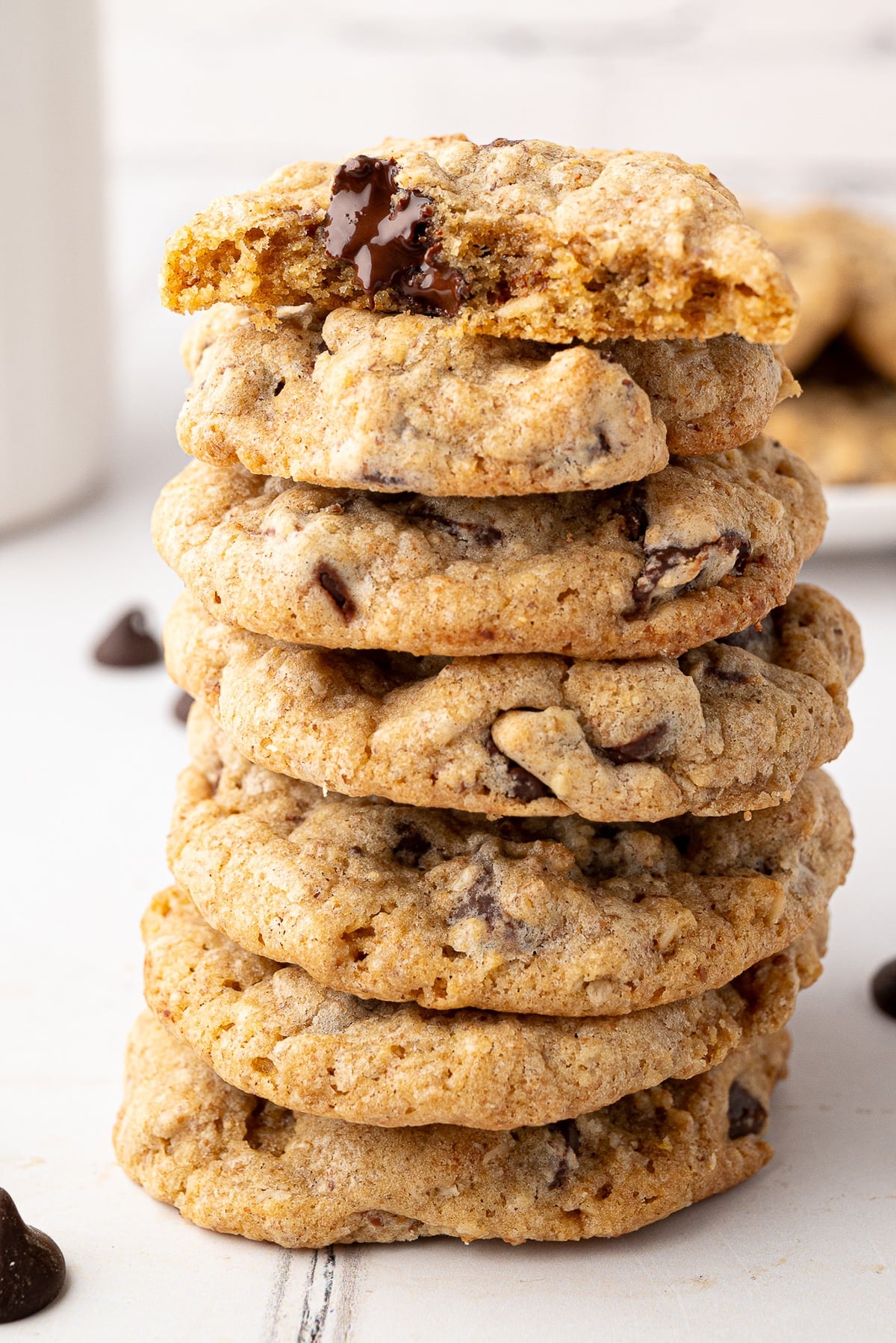 Chocolate chip cookies made with a wholesome blend of whole wheat and all-purpose flour, flaxseed, oats and plenty of chocolate chips. They are a healthier twist on the classic chocolate chip cookie that is perfect for lunch boxes, or an afternoon treat.