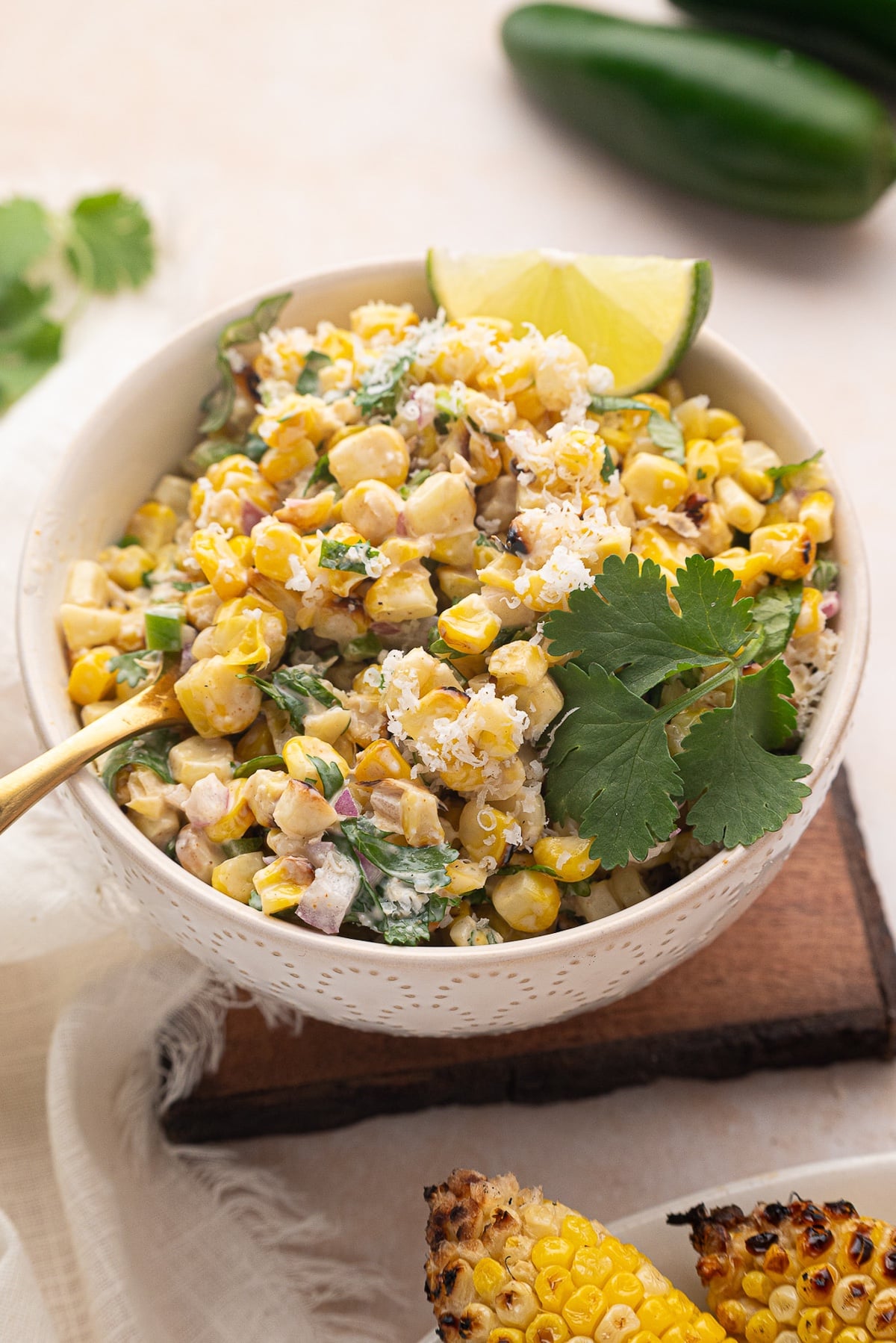 - Add corn kernels to large bowl with jalapeño, red onion, and cilantro. Stir in dressing and top with cotija cheese.